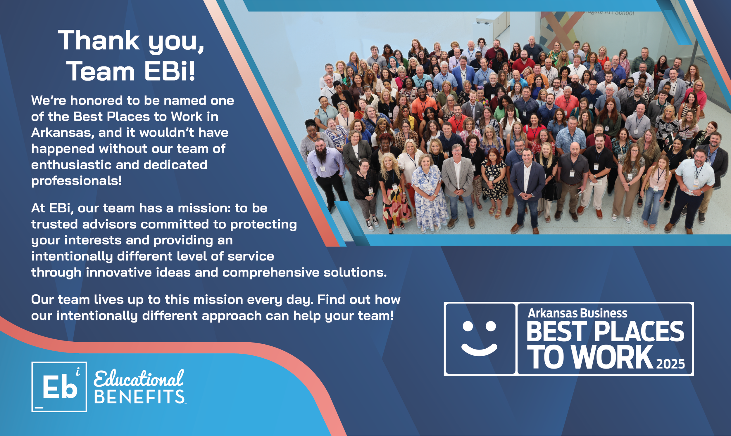 Last week, EBI leaders and team members attended a luncheon event sponsored by Arkansas Business Publishing Group, where EBI was named one of the “Best Places to Work” in Arkansas.